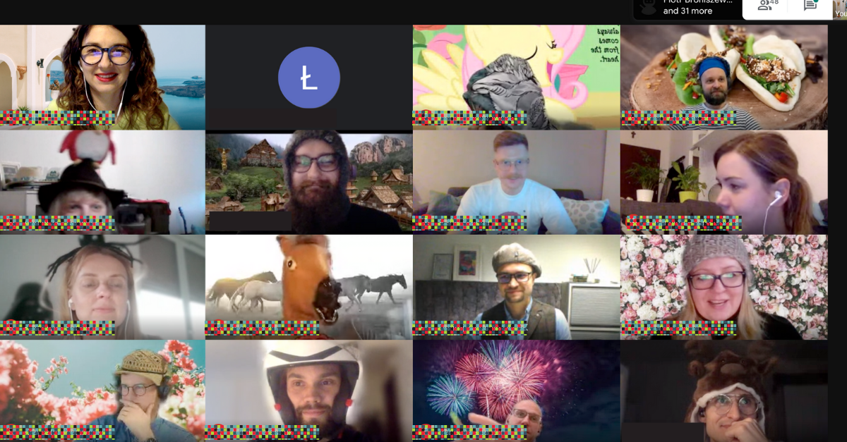The online celebration was scheduled as a surprise event for Tuesday afternoon and was organized and hosted by Kasia Leszczynska-Bohdan. Again, only a few people knew what exactly would happen. All we asked for was to book for one hour and wear a funny hat or accessories. Well… we can always count on a sense of humor of our people! There were a variety of extraordinary hats: motorcycle helmet, hedgehog hat, Egyptian cap, spider-like band, Darth Vader mask, and a horse head.