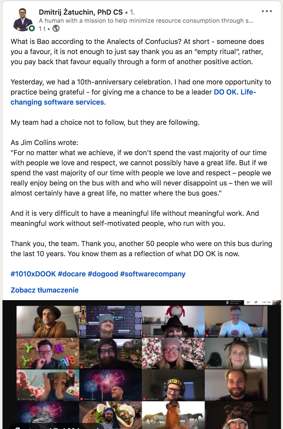 Shortly, everyone was invited to speak up. That was a space for best wishes, memories, and funny stories from the company’s past. This part was a prelude for a surprise – a fun quiz about DO OK maintained in a lightweight form. Among questions, we asked who is the most active user on Slack (including how many messages were sent so far), which project was the longest, or what was pictured in our previous logo version.