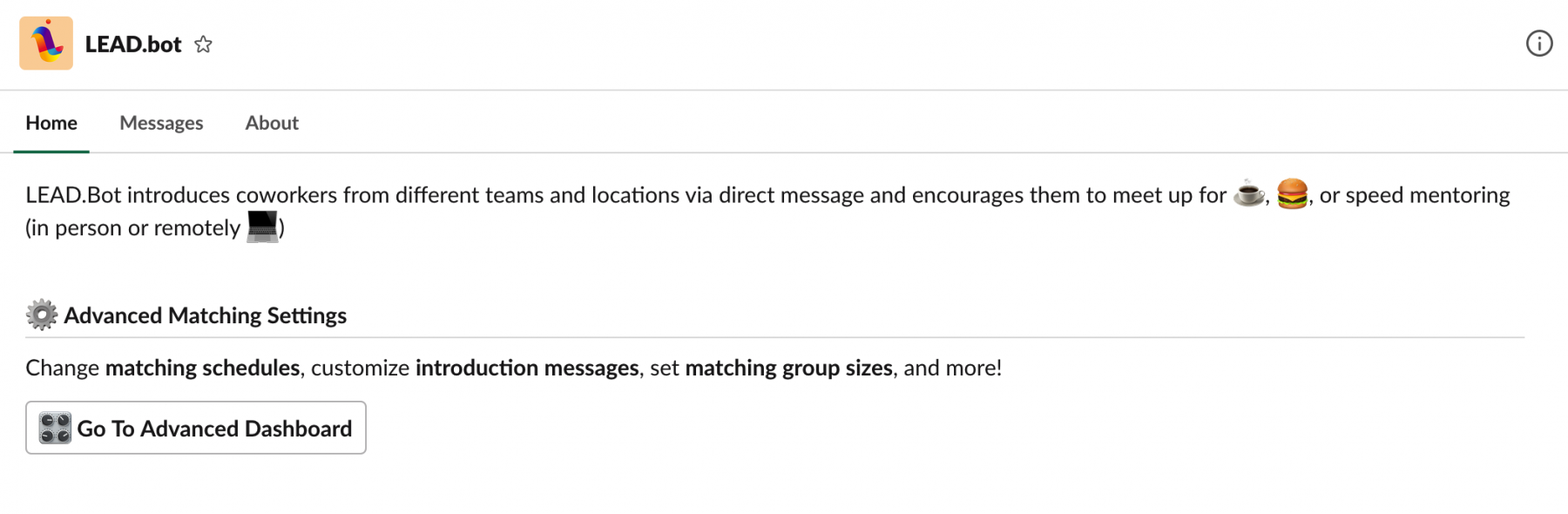 To make the matchmaking meetings easy-peasy, we’ve decided on one of the tools on Slack. Lead.bot connects coworkers to build relationships, share knowledge, and increase collaboration.