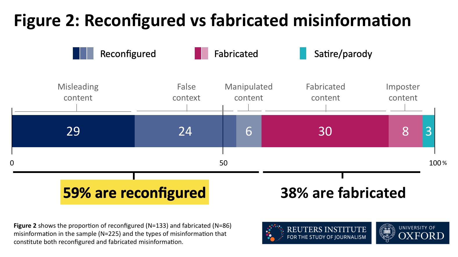 Reuters Institute Research pointed out that most of the misinformation (59%) involves various forms of changes. Current and often authentic information is being spun, twisted, recontextualized, or reworked. In the analyzed sample, 38% of misinformation was completely fabricated.